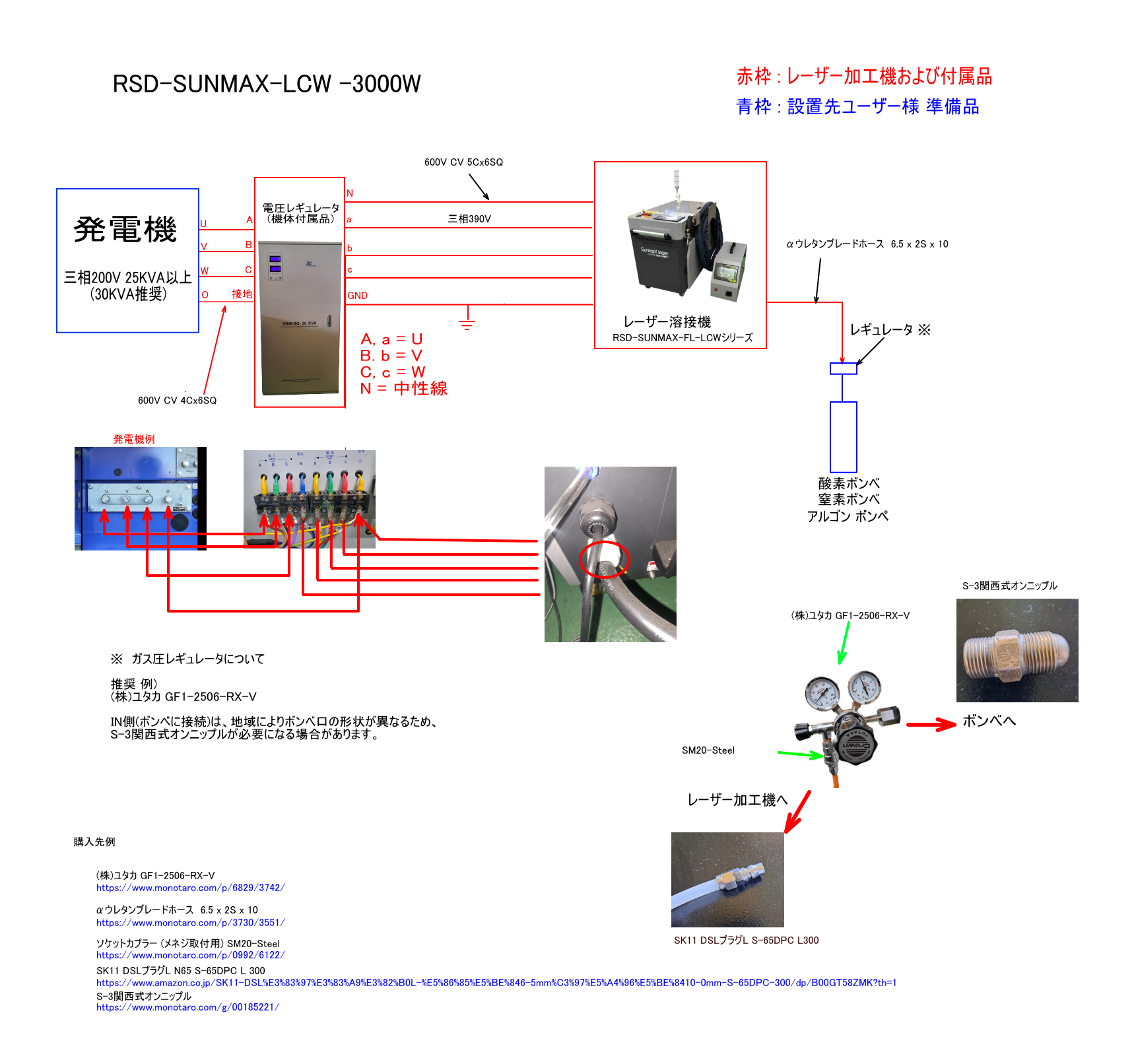 | アシストガス(ご用意必要) | 窒素 アルゴン 酸素(切断のみ) クリーンエアー(切断/洗浄のみ) アルミはアルゴン推奨 チタンはアルゴン必須 窒素 7000ℓボンベ1本 溶接は窒素かアルゴンを使用します。アルミ溶接の場合はアルゴン推奨。それ以外の素材は窒素を基本使用します。 切断では、窒素、酸素、エアー(水分、油分含まない) サビ取りは、窒素、エアー(水分、油分を含まない) |