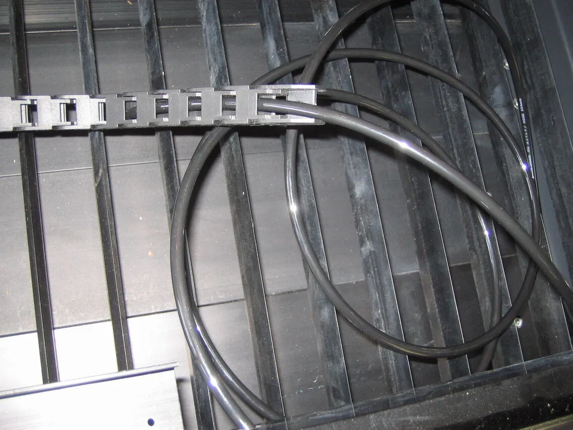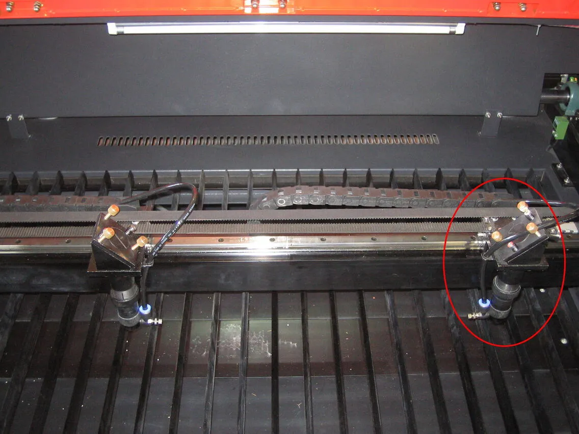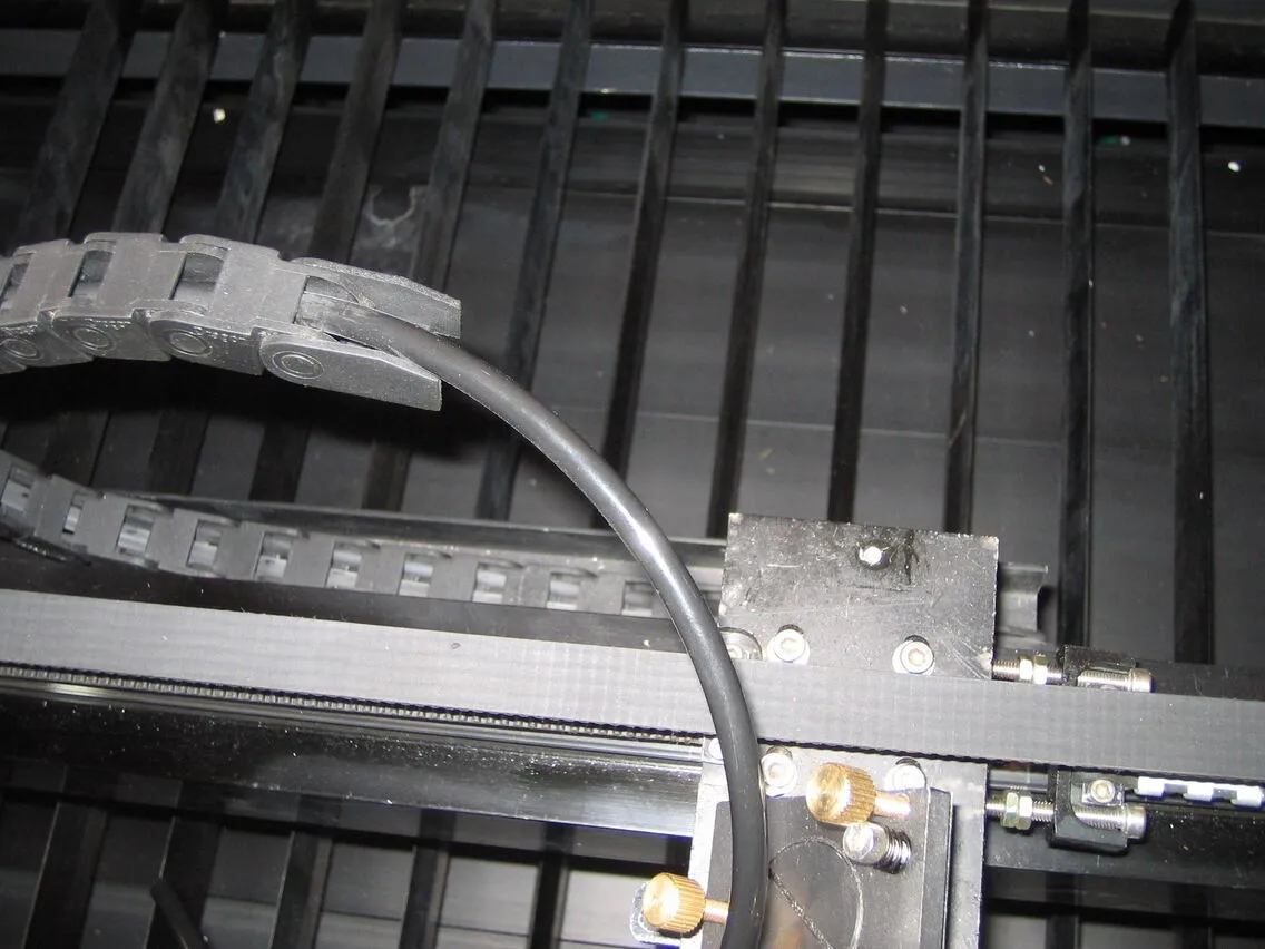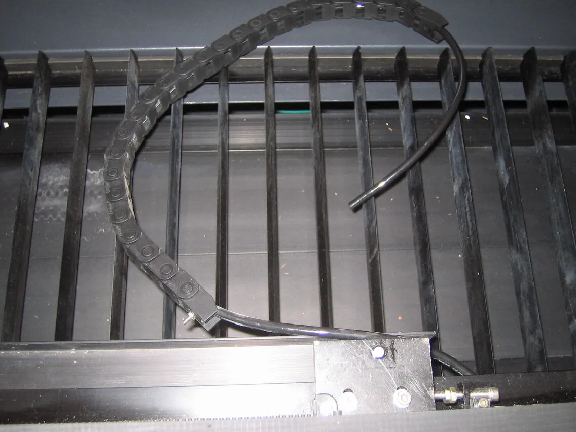 シングルヘッド用のチェーン(本体付属・長いもの)を用意し、レーザーヘッドの角パイプ穴から出ているエアーチューブを通します。図のような向きで通してください。