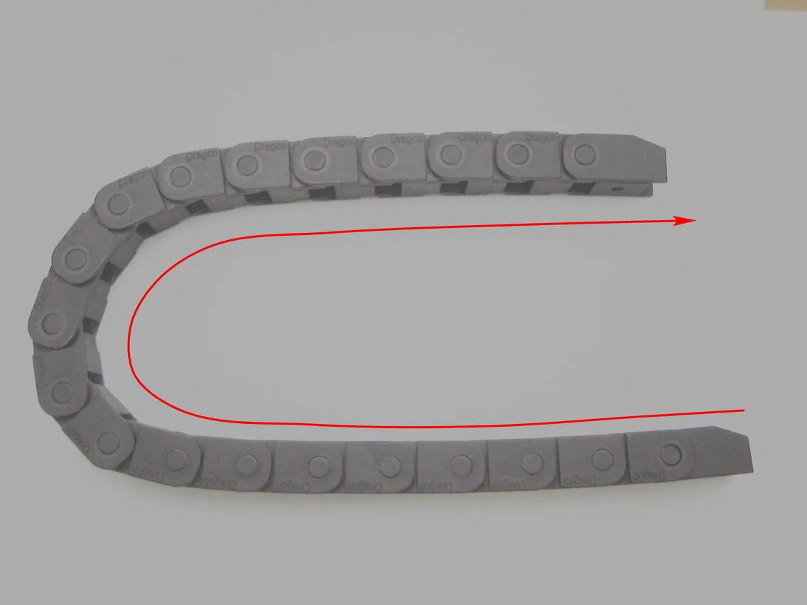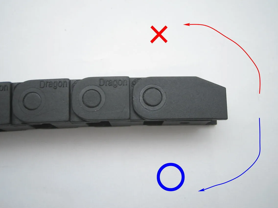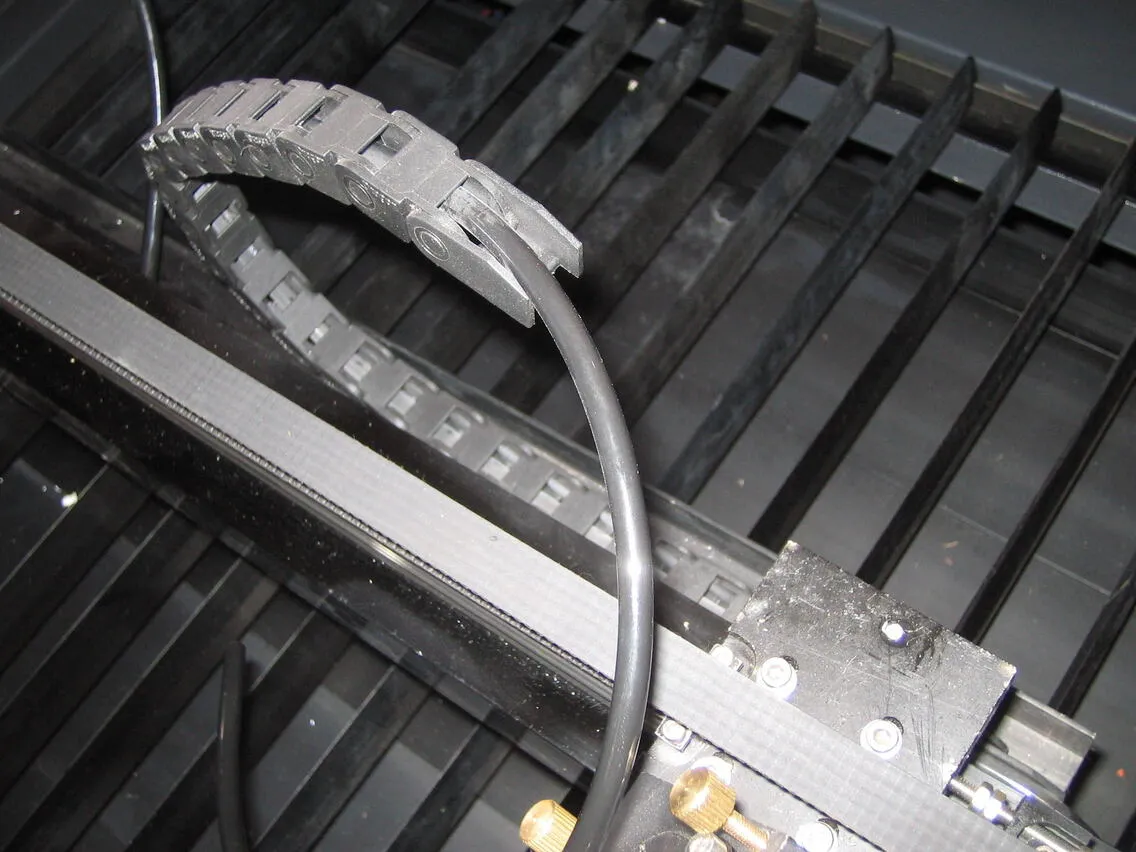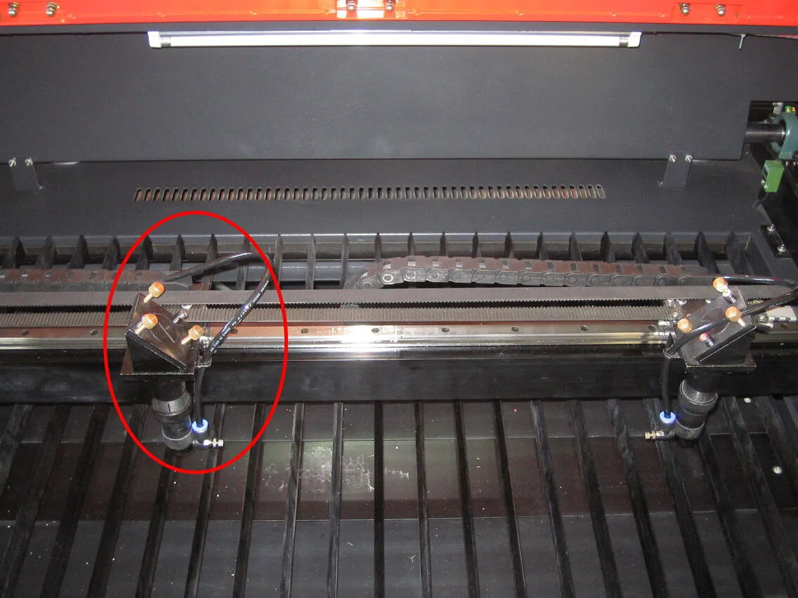 シングルヘッド用のチェーン(本体付属・長いもの)を用意し、レーザーヘッドの角パイプ穴から出ているエアーチューブを通します。図のような向きで通してください。