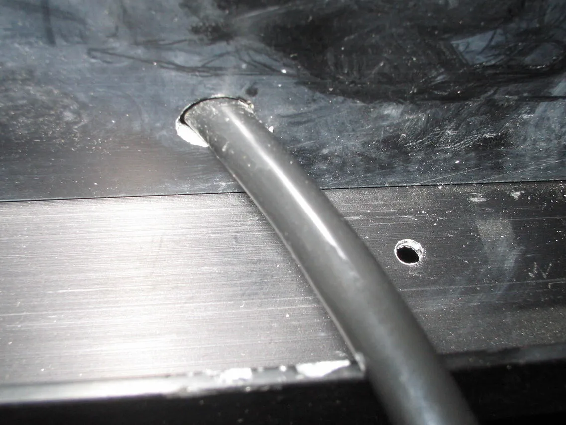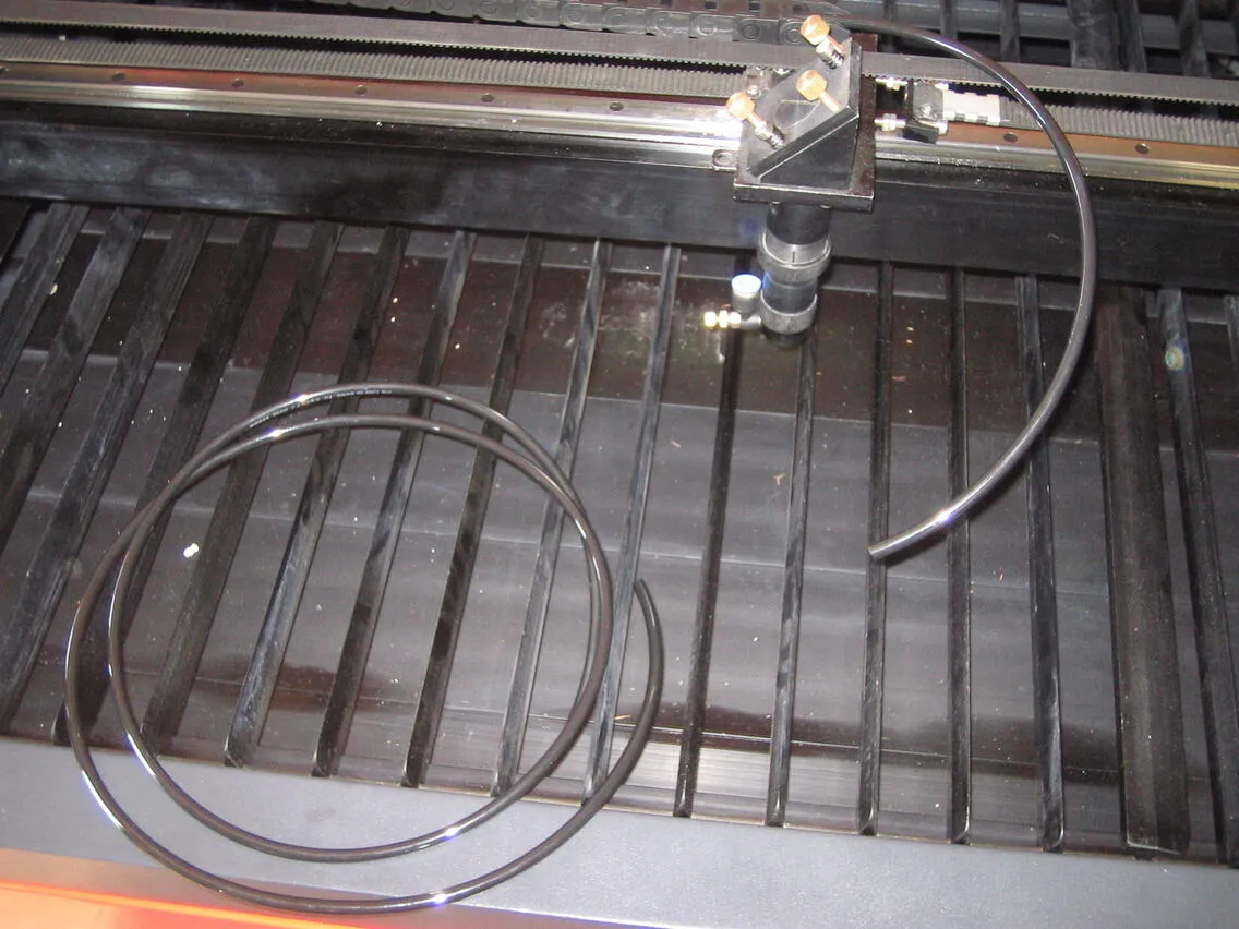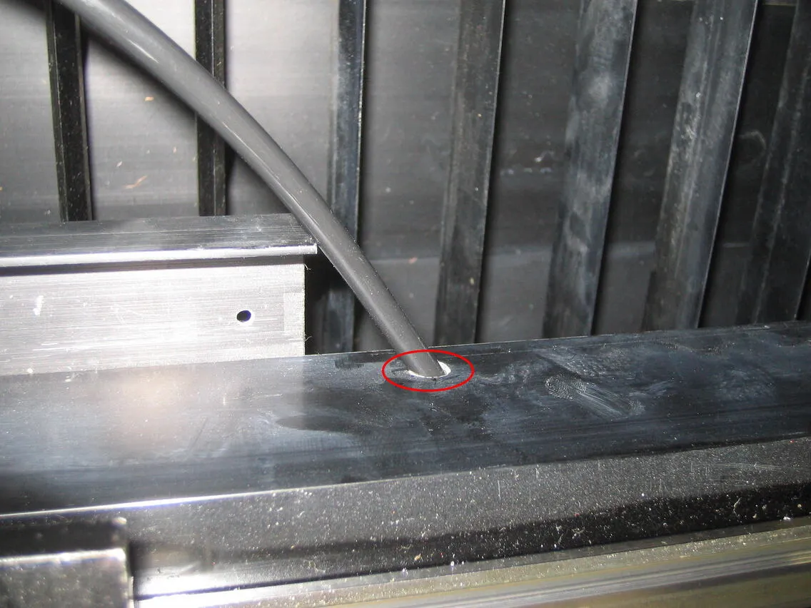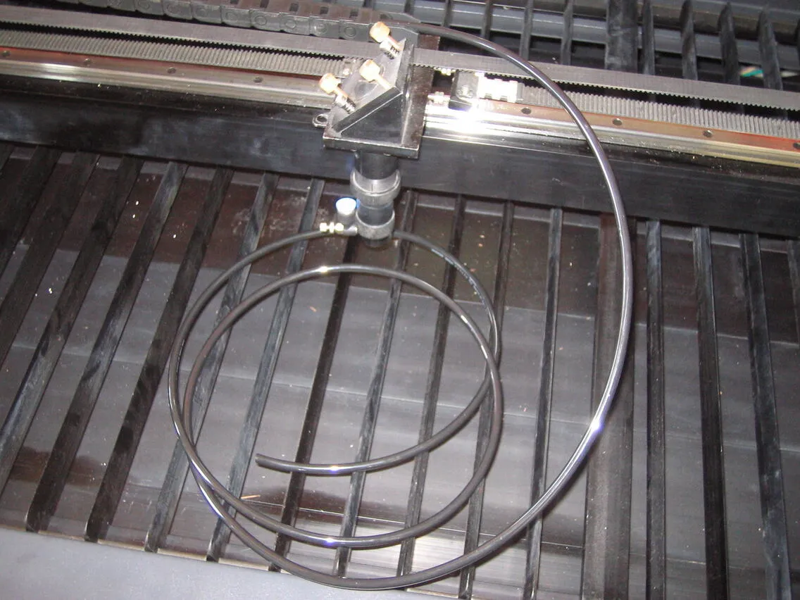 取り外したエアーチューブよりも長いチューブを用意し(本体に添付)、レーザーヘッドの角パイプ穴から、通していきます。