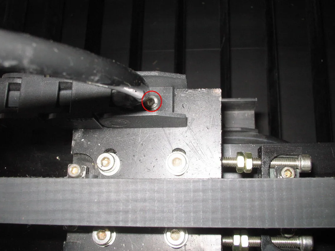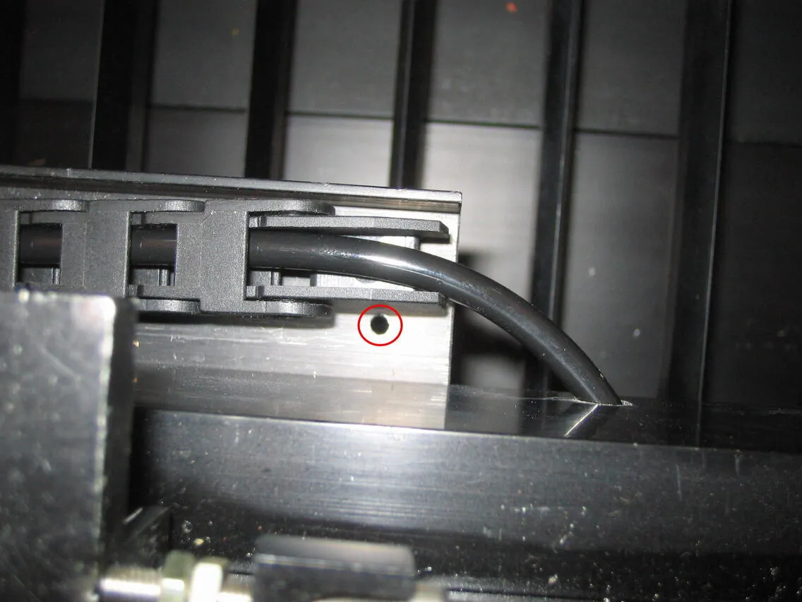 樹脂チェーンのもう一方の固定ネジを外します。角パイプ側面から出ているエアーチューブを少しだけ引っ張って作業しやすくします。強く引っ張るとチューブが破損する恐れがあるので、慎重に引っ張り出してください。
