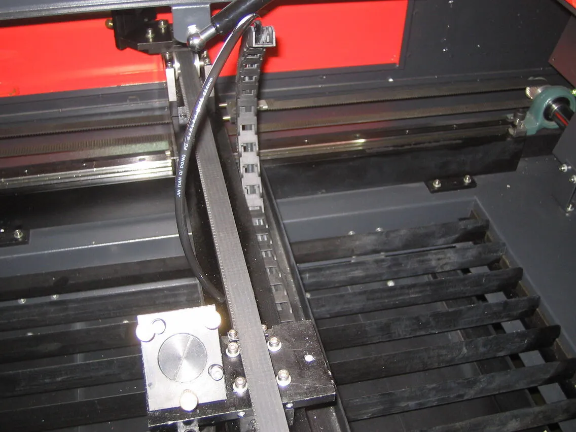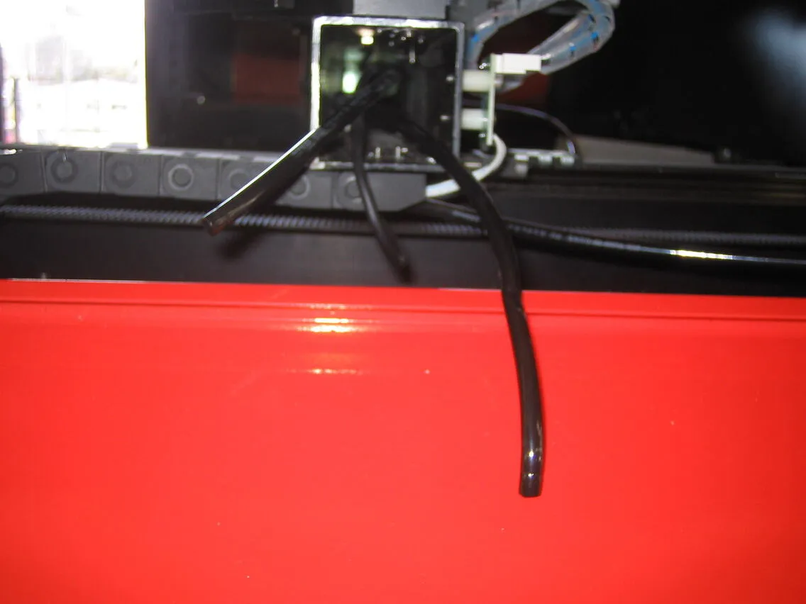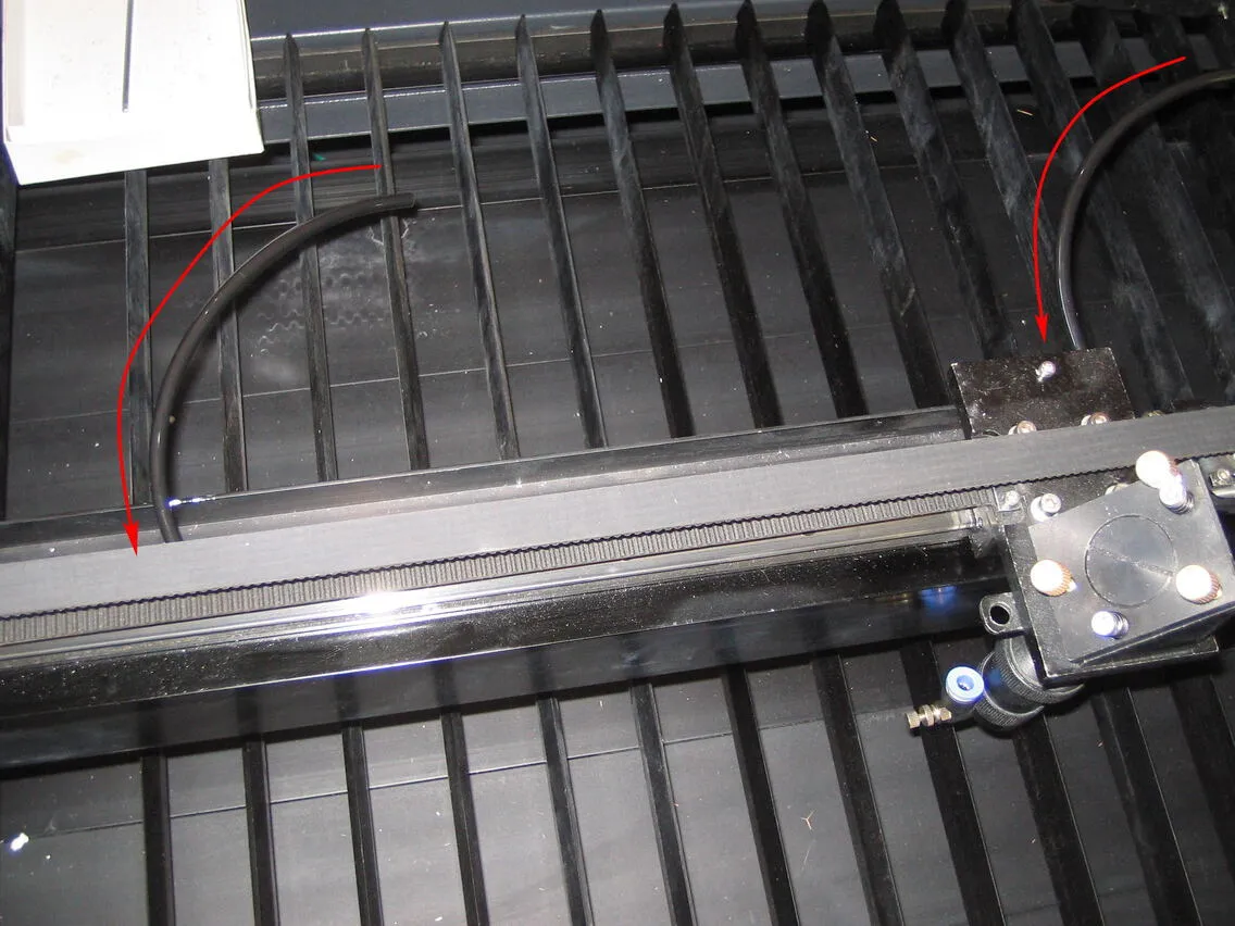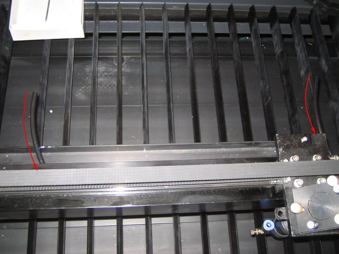 それぞれのレーザーヘッドの角パイプの穴へエアーチューブを少しずつ押し込み、角パイプの端から少しずつ引っ張り出してください。角パイプ内のネジなどに引っかかったり、チューブが折れ曲がったりするので、少しずつ作業を進めてください。