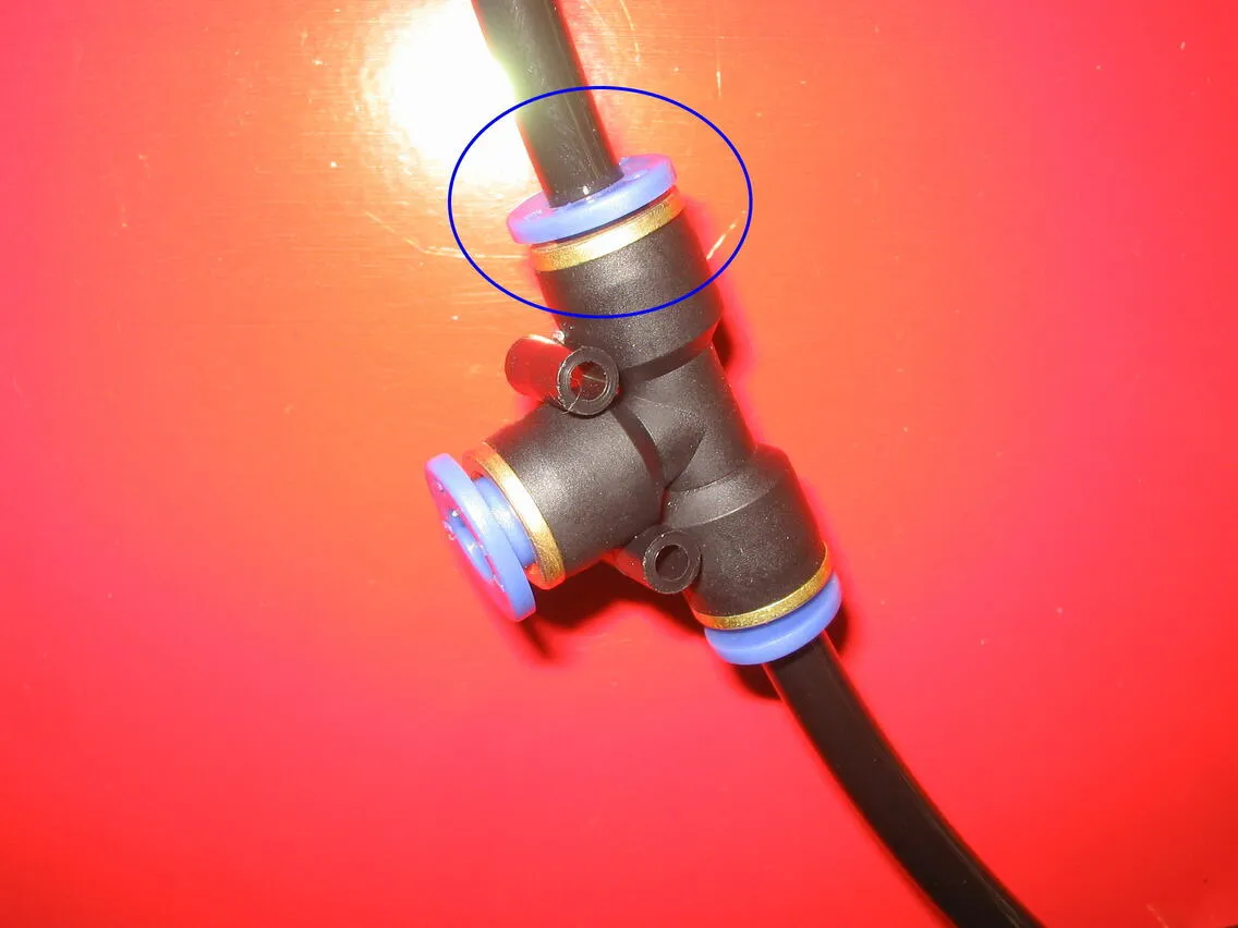 レーザーベッドの角パイプ穴から通したチューブを角パイプ端から取り出し、継ぎ手に接続します。チューブを角パイプ内を通すときにはネジなどの障害物に引っかかったり、あるいはバリなどでチューブ自体が傷ついたりする場合がありますので、慎重に少しずつ通していってください。継ぎ手への接続は、チューブを青リングに入れ、止まるまで押し込んでください。