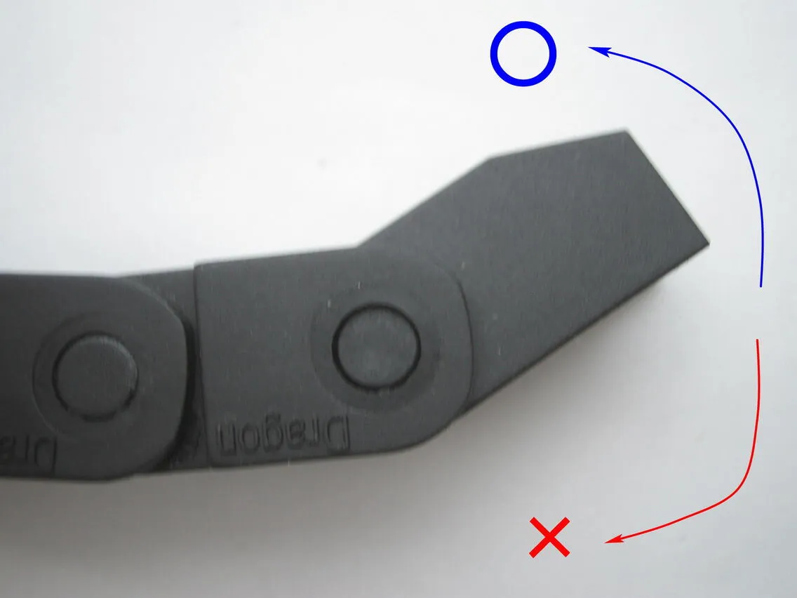 初めてシングルヘッド用チェーンを使用する際には、駒の向きが逆の場合があります。その際は、マイナスドライバーなどで勘合部を開いて駒をはずし、逆にして取り付けてください。端の駒は内側で嵌め合うようになります。